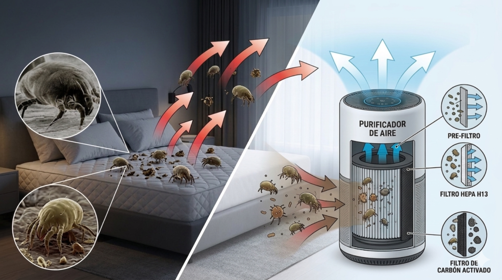 Es fundamental tener claro que un purificador antiacaros no elimina los ácaros vivos que están incrustados en los tejidos de las telas. Su función es limpiar el aire de sus alérgenos, pero no puede aspirar un colchón o un sofá.