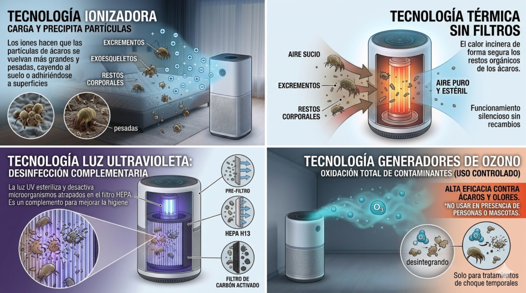 La luz UV mata bacterias y virus. Baja eficacia contra ácaros por sí sola. No es efectiva para eliminar el polvo o los alérgenos particulados. Suele combinarse con filtros HEPA para una mayor efectividad. Es un complemento, no una solución principal para los ácaros.